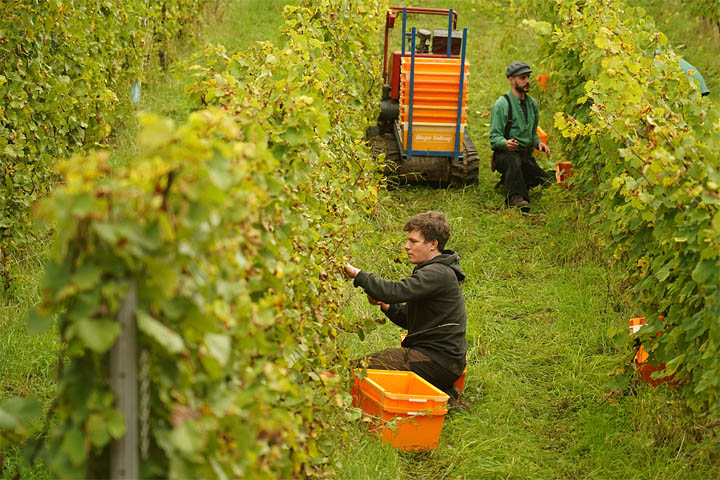 Wie jedes Jahr, alle packen an. Nicht nur im Weinberg. Im Kelterhaus und Weinkeller ist jede Menge Arbeit nach der Ernte im Weinberg. Seit Jahren ist unser Ernteteam eingespielt. Neue Helfer werden umgehend eingebunden. Ohne dass großartige Anweisungen unsererseits gegeben werden, verteilen sich die Helfer nach kurzem beratschlagen im Weinberg auf die Rebzeilen zum Ernten. Der Traubentransport mit dem Kettenschlepper wird auch unter den Helfern geklärt.